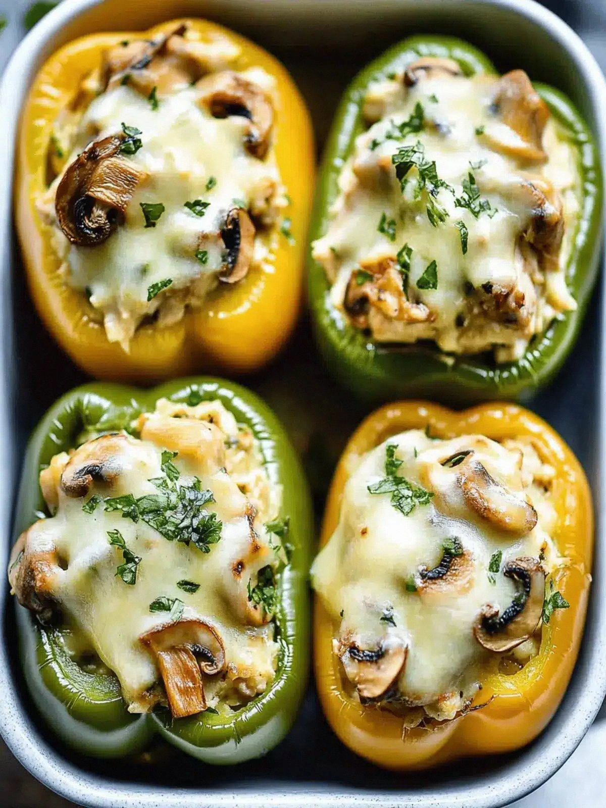 Picture the scene: a golden rim of pepper, a glossy, velvety sauce that clings to the inside like a secret whisper, and the faint aroma of fresh thyme dancing over a simmering base of onions and mushrooms. As the bell peppers roast, their skins caramelize to a deep amber, releasing a sweet, earthy sweetness that pairs perfectly with the creamy broth. The sound of the bubbling mixture is a comforting lullaby that signals everything is falling into place. The texture is a delightful contrast: tender, bite‑sized chicken cubes, silky sauce, and the occasional crunch from the sautéed celery. And when you take a bite, the flavors mingle in a harmonious chorus that sings of comfort and indulgence.
