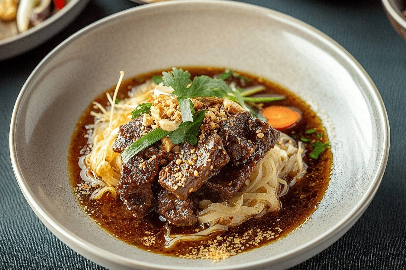 Cornstarch is the unsung hero that gives the broth its silky, slightly thick consistency. It coats the noodles and beef, creating a luxurious mouthfeel. The beef is marinated in soy sauce, dark soy, sugar, and a touch of water, ensuring it stays tender after searing. If you omit the cornstarch, the broth will remain thin and watery, missing the velvety finish that defines this dish. The flour noodles provide a hearty chew that balances the richness of the sauce.