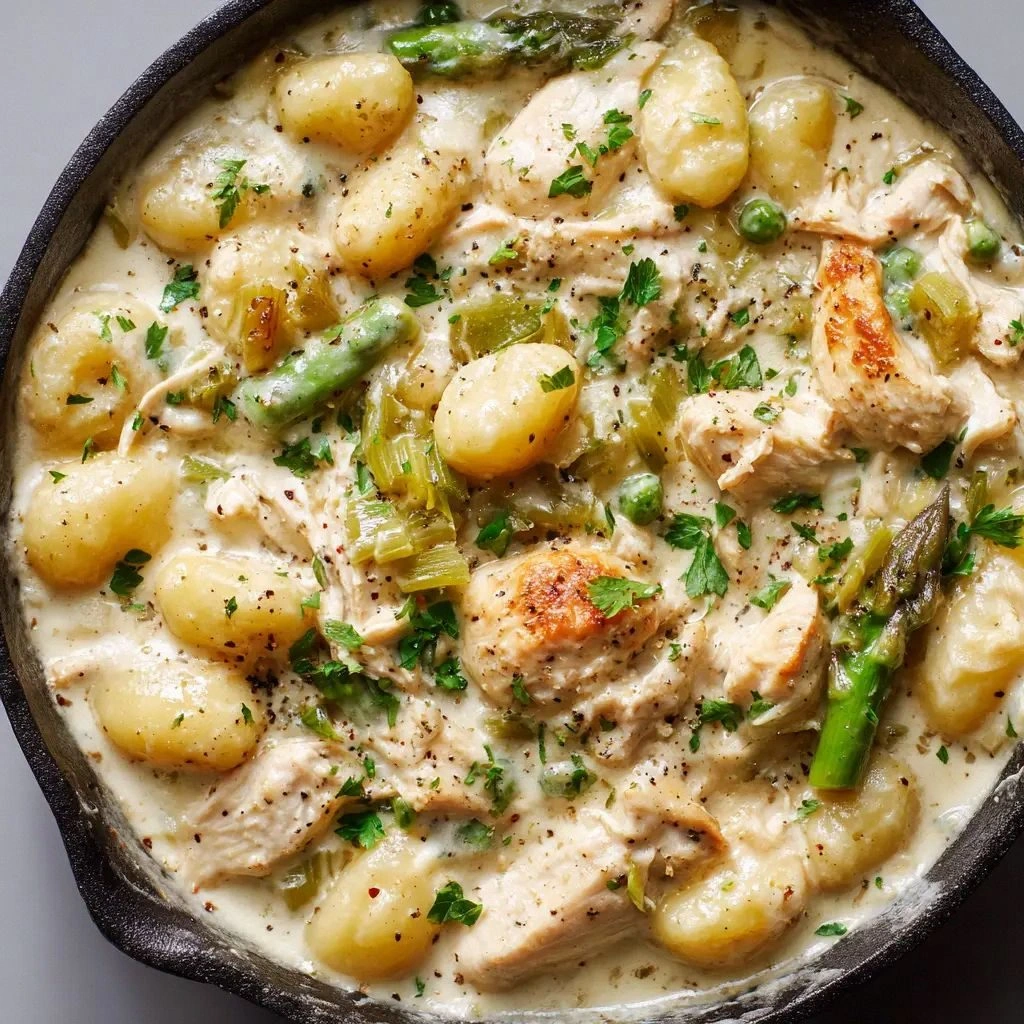 From the first sizzling sound, the kitchen filled with a warm, savory aroma that felt like a hug from a grandma’s kitchen. The air smelled of crisp celery and fresh asparagus, mingling with the buttery richness that would soon coat the gnocchi. My eyes followed the golden edges of the chicken, while my fingers felt the gentle heat of the pan. I could taste the promise of a creamy sauce that would cling to each pillowy potato dumpling. The texture was already forming in my mind—soft gnocchi, tender chicken, and a velvety sauce that would melt in your mouth.